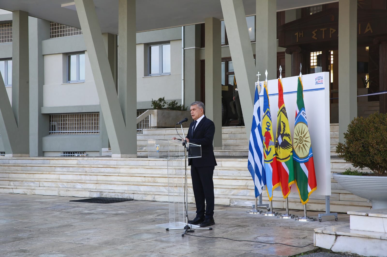 Στον σύντομο χαιρετισμό του ο Αρχηγός ΓΕΕΘΑ εξέφρασε την ιδιαίτερη ικανοποίησή του για την υλοποίηση του έργου που σχεδιάστηκε και προωθήθηκε επί της Διοικήσής του στην 1η ΣΤΡΑΤΙΑ, με την συνδρομή της Περιφέρειας Θεσσαλίας ως προς την ένταξή του στο Επιχειρησιακό της Πρόγραμμα του Εθνικού Στρατηγικού Πλαισίου Αναφοράς (ΕΣΠΑ). Αναφέρθηκε επίσης στη σημασία της ενεργειακής αναβάθμισης του Στρατηγείου, με την οποία βραχυπρόθεσμα εξοικονομούνται σημαντικοί πόροι τόσο από την μείωση των λειτουργικών απαιτήσεων όσο και του κόστους συντήρησης του κτιρίου, συμβάλλοντας στην μείωση του ενεργειακού αποτυπώματος του Στρατοπέδου «ΣΤΡΑΤΗΓΟΥ ΝΙΚΟΛΑΟΥ ΠΛΑΣΤΗΡΑ».