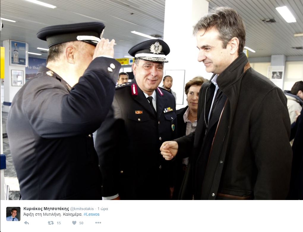 Στην Μυτιλήνη βρίσκεται εδώ και λίγη ώρα ο Πρόεδρος της Νέας Δημοκρατίας, Κυριάκος Μητσοτάκης, προκειμένου να επισκεφτεί τα Κέντρα Υποδοχής προσφύγων και μεταναστών. Ο Κυριάκος Μητσοτάκης ανήρτησε στον προσωπικό του λογαριασμό στο Twitter, φωτογραφία από τη στιγμή της άφιξης του στο νησί.