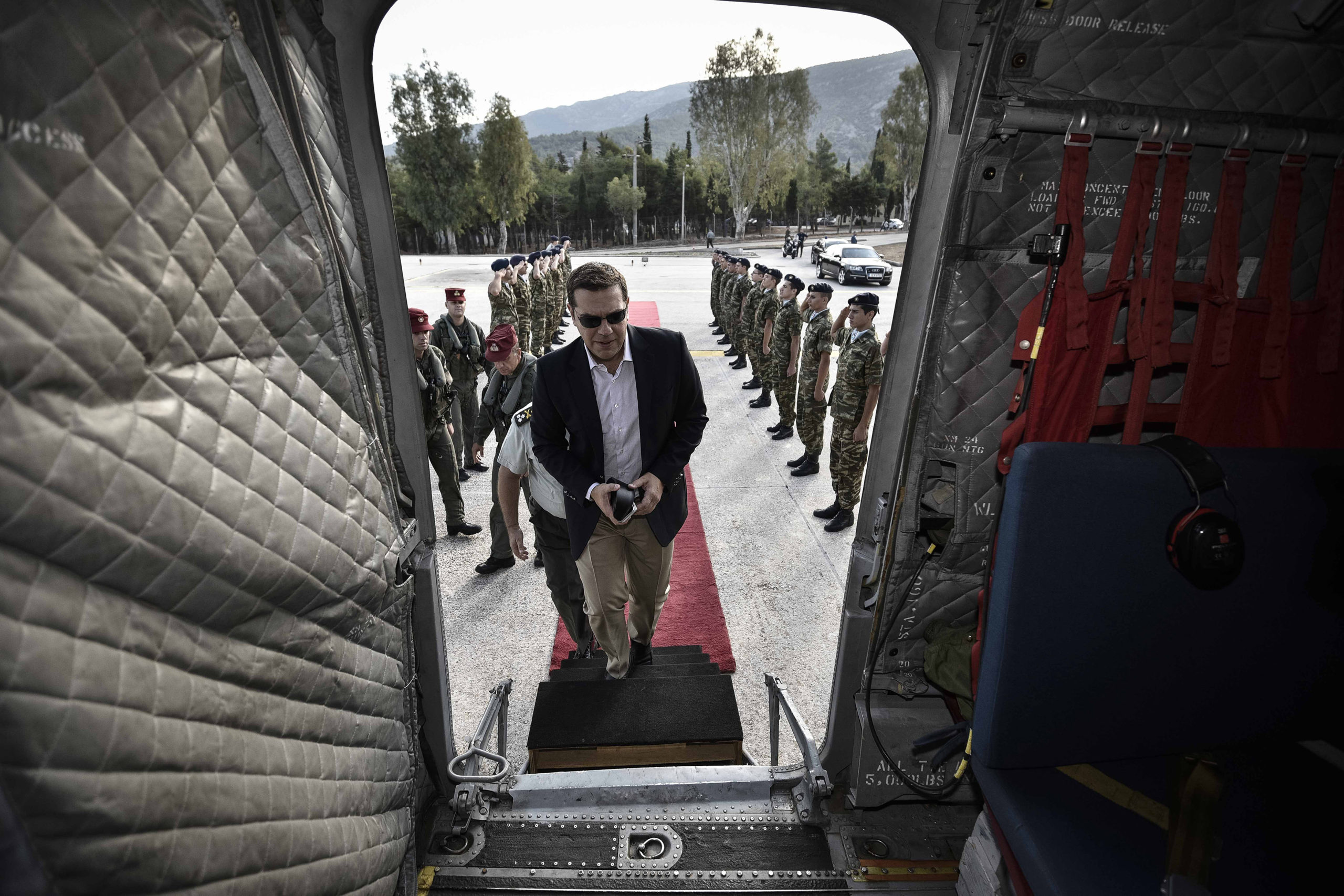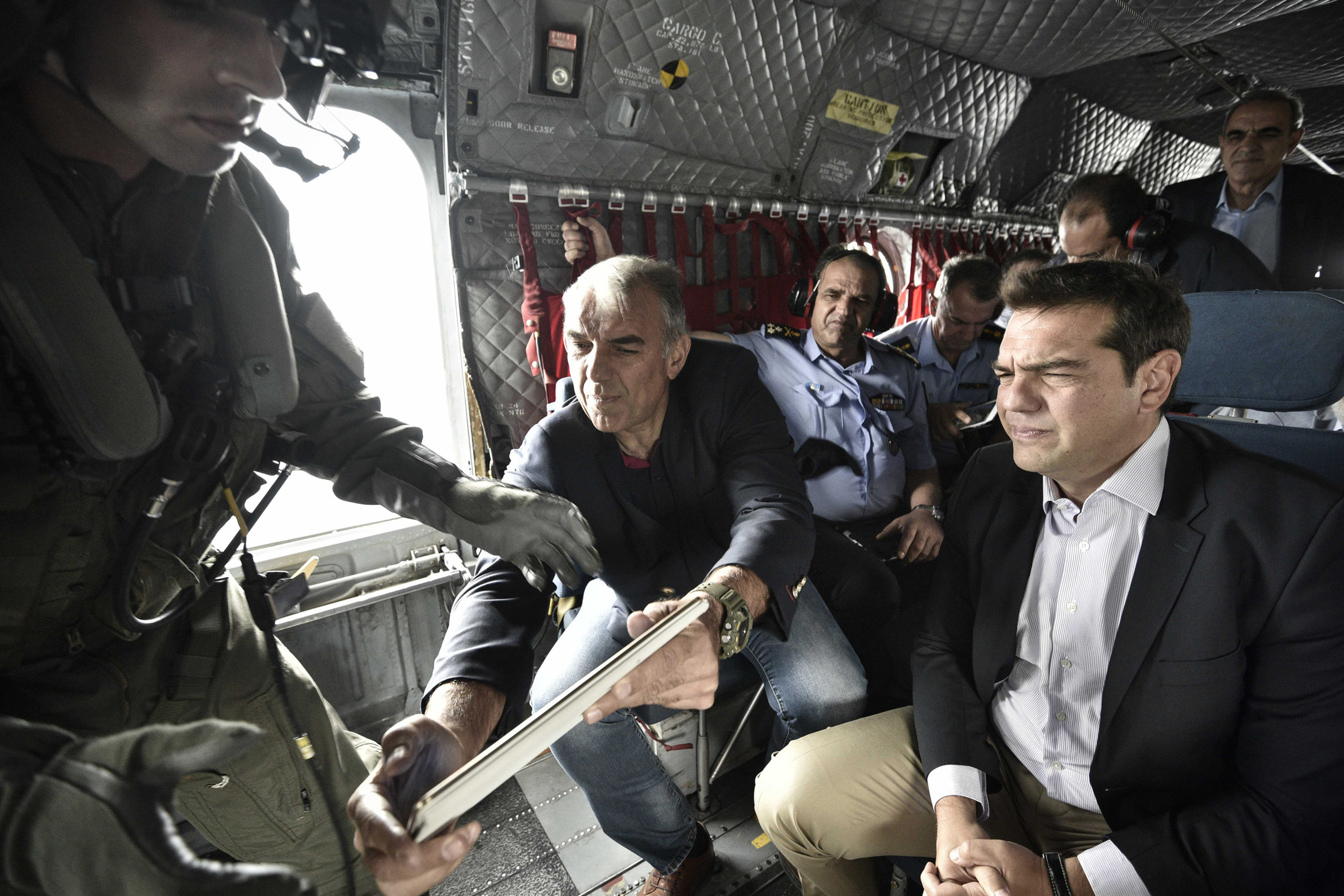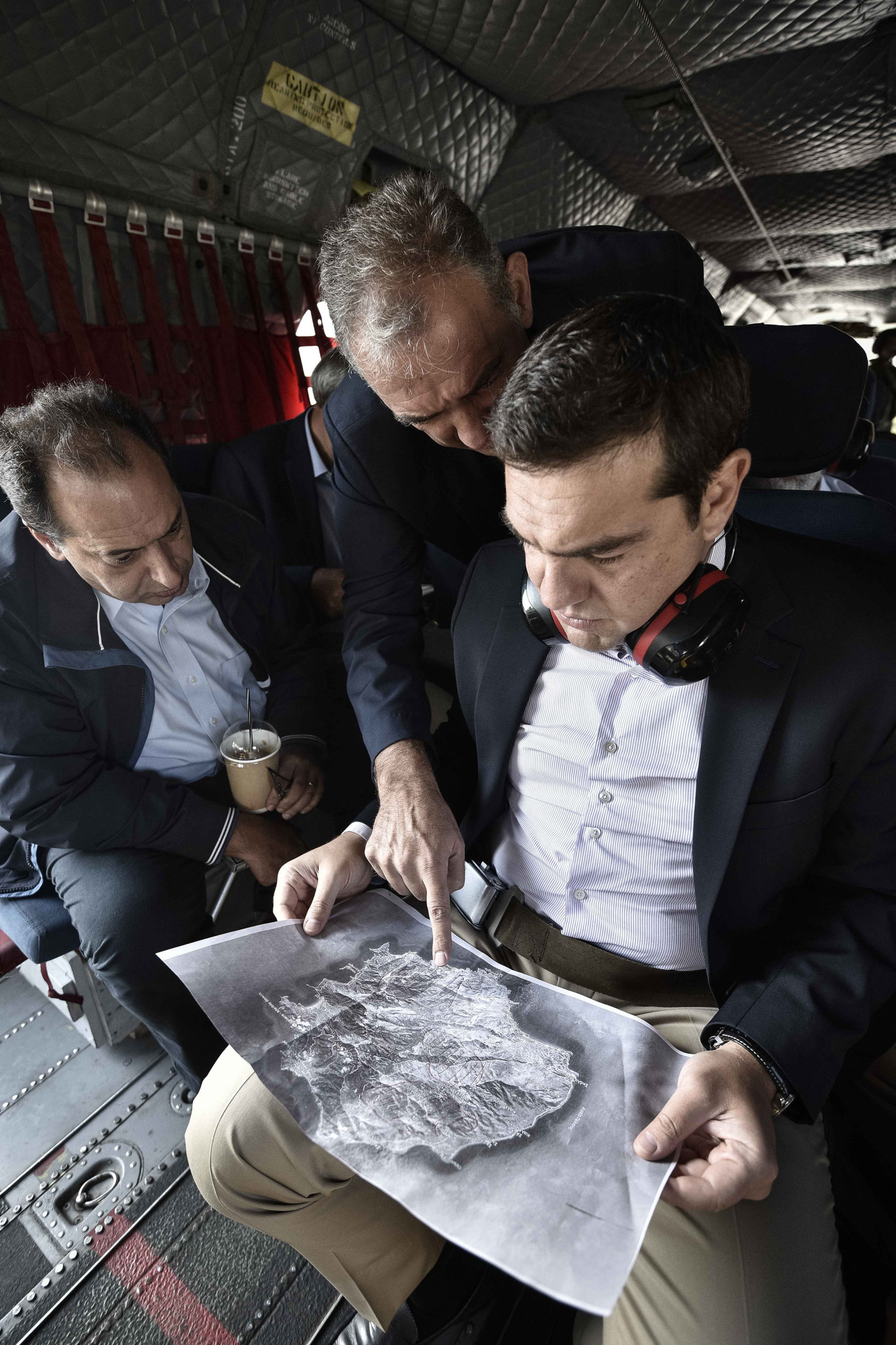 Στις φωτογραφίες απεικονίζεται ο Αλέξης Τσίπρας, ο οποίος επιβιβάστηκε στο ελικόπτερο και πέταξε πάνω από τις καμένες περιοχές.