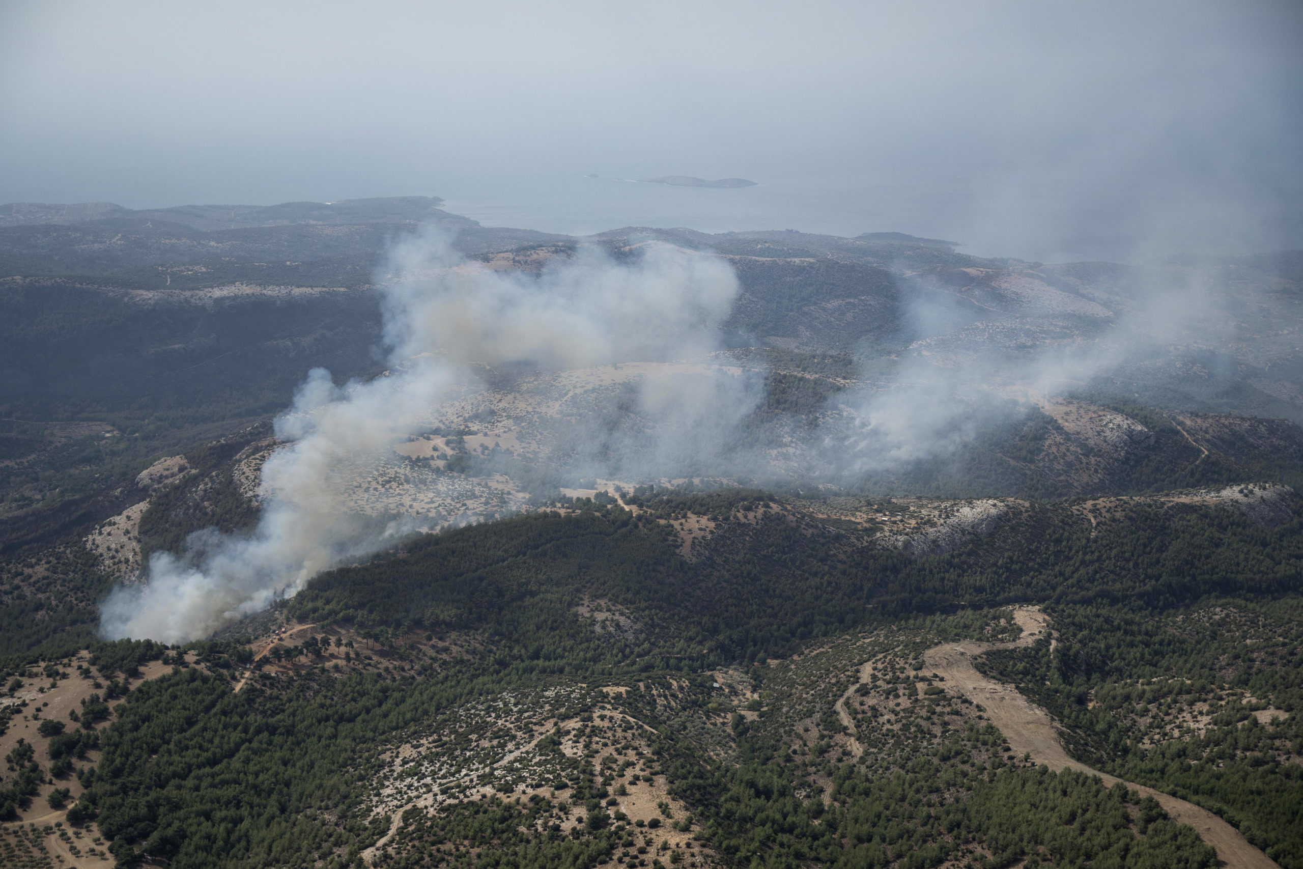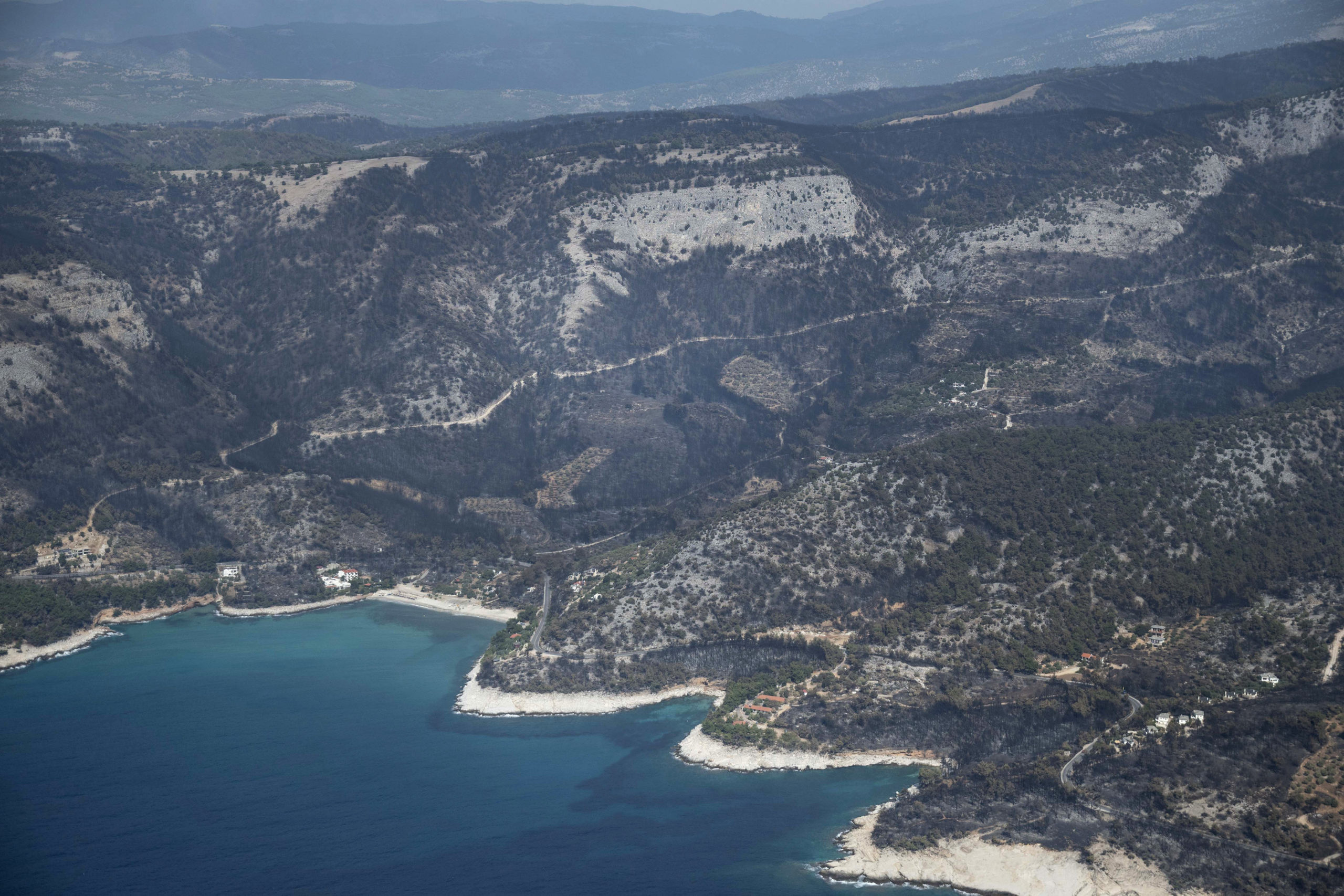 Καπνοί αναδύονται από τις καμένες περιοχές της Θάσου, ενώ ο Αλέξης Τσίπρας κοιτάζει μέσα από το παράθυρο του ελικοπτέρου, το μέγεθος της καταστροφής.
