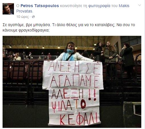 Συγκεκριμένα, ο κ. Τατσόπουλος έγραψε: «Σε αγαπάμε βρε μπαγάσα. Τι άλλο θέλεις για να το καταλάβεις; Να σου το κάνουμε φραγκοδίφραγκα;», ενώ παράλληλα ανέβασε τη φωτογραφία που έγινε viral στο διαδίκτυο και φαινόταν μία γυναίκα να κρατά ένα πανό για τον Αλέξη Τσίπρα.