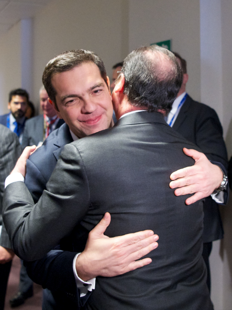 Ο θερμός χαιρετισμός του Πρωθυπουργού Αλέξη Τσίπρα με τον Πρόεδρο της Γαλλίας Φρανσουά Ολάντ κατά τη διάρκεια της τριμερής συνάντησης στις Βρυξέλλες.