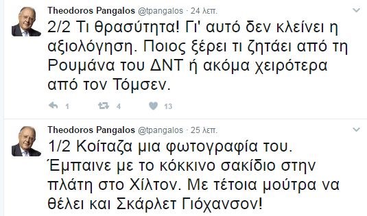 Με μια αιχμηρή ανάρτηση στον λογαριασμό του στο twitter ο πρώην υπουργός Θεόδωρος Πάγκαλος αναφέρεται στην πρόσφατη δήλωση του υπουργού Οικονομικών Ευκλείδη Τσακαλώτου για την διάσημη ηθοποιό Σκάρλετ Γιόχανσον και σχολιάζει παράλληλα τις εξελίξεις στη διαπραγμάτευση.”Κοίταζα μια φωτογραφία του. Έμπαινε με το κόκκινο σακίδιο στην πλάτη στο Χίλτον. Με τέτοια μούτρα να θέλει και Σκάρλετ Γιόχανσον! Τι θρασύτητα! Γι’ αυτό δεν κλείνει η αξιολόγηση. Ποιος ξέρει τι ζητάει από τη Ρουμάνα του ΔΝΤ ή ακόμα χειρότερα από τον Τόμσεν.” έγραψε ο κ. Πάγκαλος.