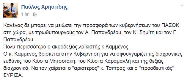 «Κανένας δεν μπορεί να μειώσει την προσφορά των κυβερνήσεων του ΠΑΣΟΚ στη χώρα, με πρωθυπουργούς τον Ανδρέα Παπανδρέου, τον Κώστα Σημίτη και τον Γιώργο Παπανδρέου. Πολύ περισσότερο ο ακροδεξιός, λαϊκιστής κ. Καμμένος. Ο κ. Καμμένος βρίσκεται στην Κυβέρνηση για να σφουγγαρίζει τις διαχρονικές ευθύνες του Κώστα Μητσοτάκη, του Κώστα Καραμανλή και της δεξιάς διαχρονικά. Να τον χαίρεται ο “αριστερός” κ. Τσίπρας και ο “προοδευτικός” ΣΥΡΙΖΑ», έγραψε.