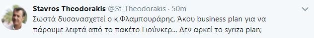 «Σωστά δυσανασχετεί ο κ. Φλαμπουράρης. Άκου business plan για να πάρουμε λεφτά από το πακέτο Γιούνκερ… Δεν αρκεί το syriza plan;» έγραψε ο κ. Θεοδωράκης.