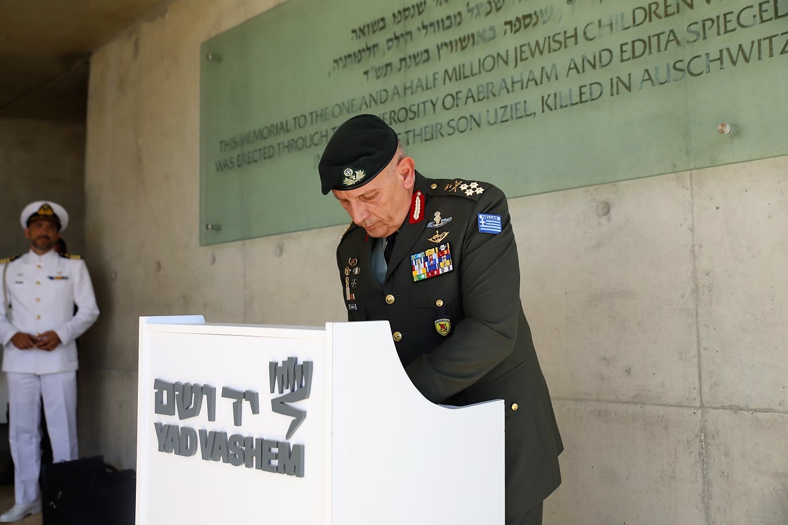 Στην συνέχεια και συνοδευόμενος από την Αναπληρωτή του Πρέσβη της Ελλάδας στο Ισραήλ κ. Λαμπρινή Κομίνη, ο Αρχηγός ΓΕΕΘΑ μετέβη στην Ιερουσαλήμ όπου επισκέφθηκε το Μουσείο Ολοκαυτώματος «Yad VaShem», κατέθεσε στεφάνι και υπέγραψε στο Βιβλίο Επισκεπτών αποτίοντας τον δέοντα Φόρο Τιμής στην Ιερή Μνήμη των 6 εκατομμυρίων Εβραίων που υπήρξαν θύματα της Ναζιστικής θηριωδίας, μεταξύ των οποίων και 67.000 Έλληνες.