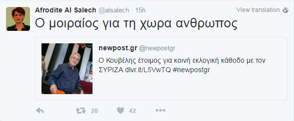 Η Αφροδίτη Αλ Σάλεχ έκανε ένα αιχμηρό σχόλιο για τον Φώτη Κουβέλη χαρακτηρίζοντας τον ως μοιραίο για τη χώρα άνθρωπο, σε ανάρτηση της στο Twitter.