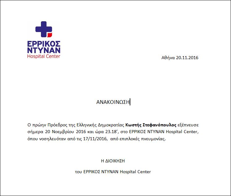 «Ο πρώην Πρόεδρος της Ελληνικής Δημοκρατίας Κωστής Στεφανόπουλος εξέπνευσε σήμερα 20 Νοεμβρίου 2016 και ώρα 23.18’, στο ΕΡΡΙΚΟΣ ΝΤΥΝΑΝ Hospital Center, όπου νοσηλευόταν από τις 17/11/2016, από επιπλοκές πνευμονίας», ανέφερε χαρακτηριστικά η ανακοίνωση του νοσοκομείου.