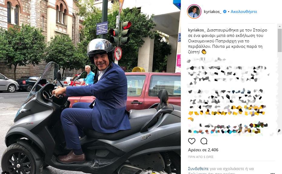 Οι δύο άνδρες είχαν αναπάντεχη συνάντηση σε φανάρι έπειτα από εκδήλωση του Οικουμενικού Πατριάρχη Βαρθολομαίου για το περιβάλλον και ο Κυριάκος Μητσοτάκης τράβηξε μία φωτογραφία τον κ. Θεοδωράκη, ο οποίος οδηγούσε scooter φορώντας το κράνος του. Εν συνεχεία ο πρόεδρος της ΝΔ την ανέρτησε στον λογαριασμό του στο Instagram γράφοντας στη λεζάντα: «Διασταυρώθηκα με τον Σταύρο σε ένα φανάρι μετά από εκδήλωση του Οικουμενικού Πατριάρχη για το περιβάλλον. Πάντα με κράνος παρά τη ζέστη! ».