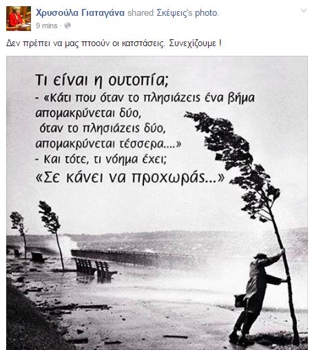 Με ανάρτησή της στο Facebook, η πρώην βουλευτής των ΑΝΕΛ Χρυσούλα Γιαταγάνα κάνει λόγο για «ουτοπία» η οποία σε κάνει να προχωράς και σχολιάζει: «δεν πρέπει να μας πτοούν οι καταστάσεις. Συνεχίζουμε».