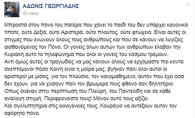 «Μπροστά στον πόνο του πατέρα που χάνει το παιδί του δεν υπάρχει κανονικά τίποτε, ούτε Δεξιά, ούτε Αριστερά, ούτε πλούτος, ούτε φτώχεια. Είναι αυτές οι στιγμές που ενώνουν όλους τους ανθρώπους και που σε κάνουν να λυγίζεις αισθανόμενος τον πόνο. Οι γονείς όλων αυτών των ανθρώπων έλαβαν την Κυριακή αυτό το τηλεφώνημα που όλοι οι γονείς του κόσμου τρέμουν» γράφει ο κ. Γεωργιάδης.