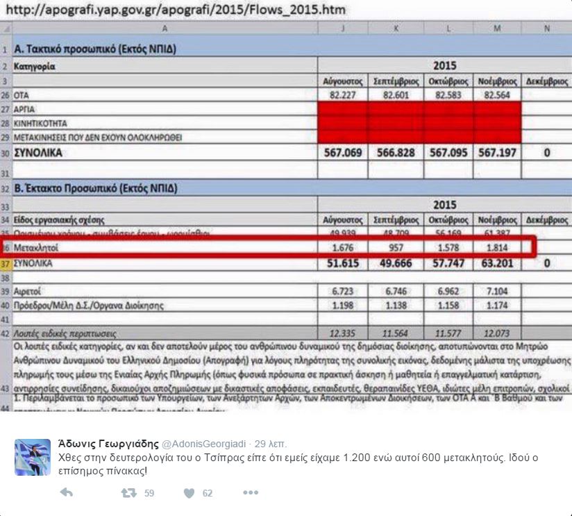 Συγκεκριμένα, ο κ. Γεωργιάδης ανέβασε ένα πίνακα με τους μετακλητούς υπαλλήλους από τον Αύγουστο του 2015 μέχρι και τον Νοέμβριο του 2015, ενώ στη συνέχεια έγραψε: «Χθες στην δευτερολογία του ο Τσίπρας είπε ότι εμείς είχαμε 1.200 ενώ αυτοί 600 μετακλητούς. Ιδού ο επίσημος πίνακας».