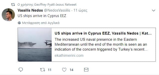 Συγκεκριμένα η ανάρτηση τιτλοφορείται “US ships arrive in Cyprus EEZ” και δημοσιεύεται με φωτογραφία αρχείου από την αγγλόφωνη έκδοση της Καθημερινής και το ρεπορτάζ της εφημερίδας για το ίδιο θέμα, σχετικά με την αυξημένη παρουσία του Πολεμικού Ναυτικού των ΗΠΑ στην Ανατολική Μεσόγειο η οποία σχετίζεται με την γεώτρηση της Εxxon.