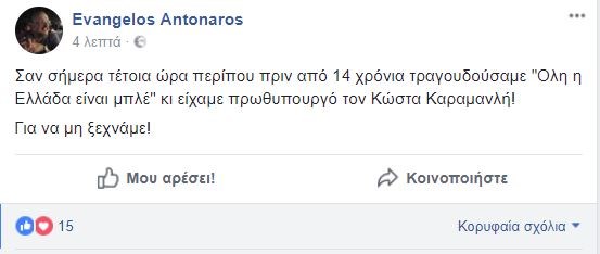«Σαν σήμερα τέτοια ώρα περίπου πριν από 14 χρόνια τραγουδούσαμε “Όλη η Ελλάδα είναι μπλε” και είχαμε πρωθυπουργό τον Κώστα Καραμανλή! Για να μην ξεχνάμε!», έγραψε χαρακτηριστικά ο κ. Αντώναρος.