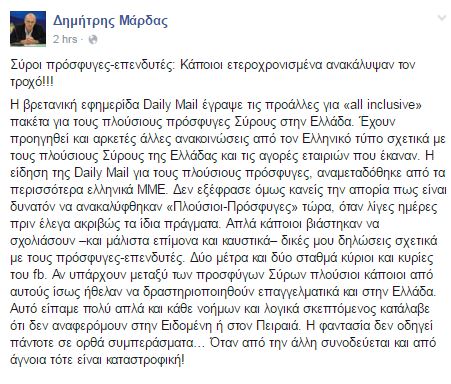 Ο υφυπουργός Εξωτερικών Δημήτρης Μάρδας σε ανάρτησή του στο Facebook, σχολιάζει το δημοσίευμα της Daily Mail σχετικά με τα «all inclusive» πακέτα που προσφέρονται σε πλούσιους Σύρους πρόσφυγες στην Ελλάδα και επισημαίνει ότι «δεν εξέφρασε κανείς την απορία πως είναι δυνατόν να ανακαλύφθηκαν «πλούσιοι – πρόσφυγες» τώρα, όταν λίγες ημέρες πριν έλεγα ακριβώς τα ίδια πράγματα.»