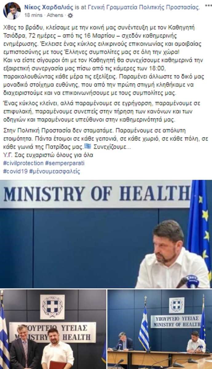 Ο υφυπουργός Πολιτικής Προστασίας, Νίκος Χαρδαλιάς, έκανε ανάρτηση στον προσωπικό του λογαριασμό στο Facebook για το τέλος των καθημερινών ενημερώσεων για την πορεία του κορονοϊού στη χώρα μας,