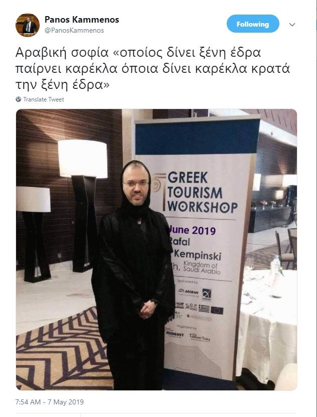 “Αραβική σοφία «οποίος δίνει ξένη έδρα παίρνει καρέκλα όποια δίνει καρέκλα κρατά την ξένη έδρα»” έγραψε και συνόδευσε την ανάρτηση με μια φωτογραφία τροποποιημένη μέσω photoshop .