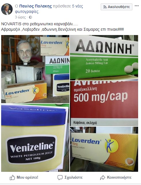 Συγκεκριμένα, ο κ. Πολάκης ανήρτησε στον λογαριασμό του στο Facebook μία φωτογραφία, όπου φαίνονται φάρμακα που παραπέμπουν στα ονόματα του Δημήτρη Αβραμόπουλου, του Ανδρέα Λοβέρδου, του Άδωνι Γεωργιάδη, του Ευάγγελου Βενιζέλου και του Αντώνη Σαμαρά.