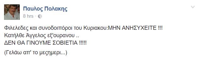 “Φιλελέδες και συνοδοιπόροι του Κυριάκου: Μην ανησυχείτε! Κατήλθε Άγγελος εξ’ ουρανού… Δεν θα γίνουμε Σοβιετία! (Γελάω απ’ το μεσημέρι…)” έγραψε ο κ. Πολάκης.