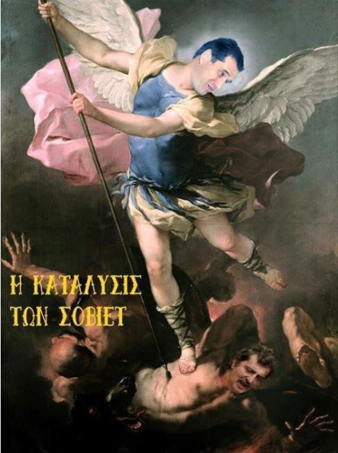 Ο κ. Πολάκης ανέβασε στον λογαριασμό του στο Facebook μια εικόνα όπου παρουσιάζει τον Άδωνι Γεωργιάδη σε ρόλο αγγέλου να καρφώνει με τη λόγχη του τον… «δαίμονα», Παύλο Πολάκη. Το… έργο τιτλοφορείται: «Η κατάλυσις των Σοβιέτ».