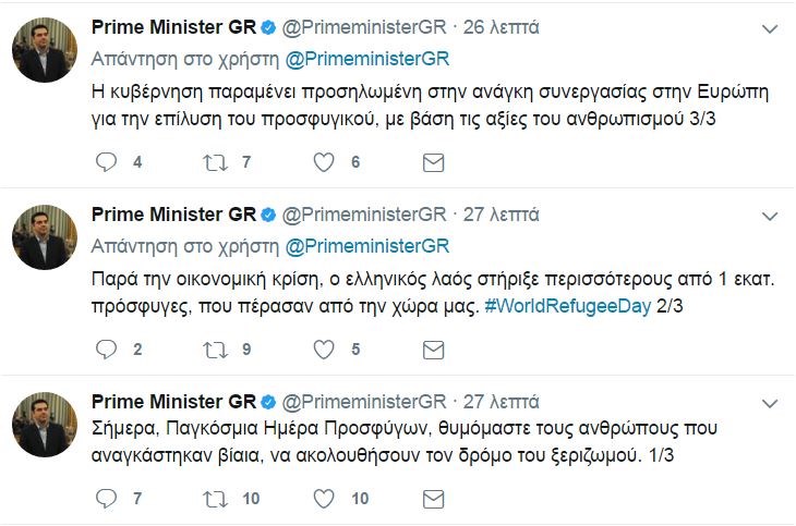 «Η κυβέρνηση παραμένει προσηλωμένη στην ανάγκη συνεργασίας στην Ευρώπη για την επίλυση του προσφυγικού, με βάση τις αξίες του ανθρωπισμού», τονίζει ο πρωθυπουργός Αλέξης Τσίπρας, με ανάρτησή του στον προσωπικό του λογαριασμό στο Twitter, για τη σημερινή Παγκόσμια Ημέρα Προσφύγων, και σημειώνει πως ο ελληνικός λαός στήριξε περισσότερους από 1.000.000 πρόσφυγες που πέρασαν από τη χώρα μας, παρά τις συνθήκες οικονομικής κρίσης.«Σήμερα, Παγκόσμια Ημέρα Προσφύγων, θυμόμαστε τους ανθρώπους που αναγκάστηκαν βίαια, να ακολουθήσουν τον δρόμο του ξεριζωμού. Παρά την οικονομική κρίση, ο ελληνικός λαός στήριξε περισσότερους από 1 εκατομμύριο πρόσφυγες, που πέρασαν από την χώρα μας. Η κυβέρνηση παραμένει προσηλωμένη στην ανάγκη συνεργασίας στην Ευρώπη για την επίλυση του προσφυγικού, με βάση τις αξίες του ανθρωπισμού», αναφέρει χαρακτηριστικά στην ανάρτησή του ο Αλέξης Τσίπρας.