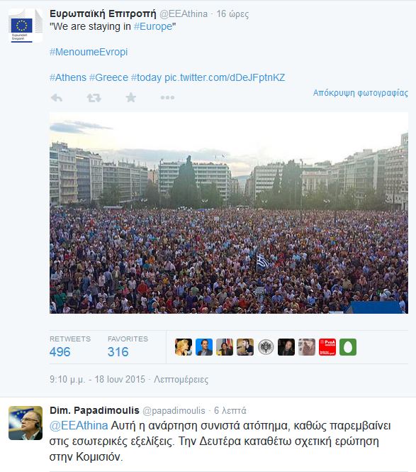 Η φωτογραφία που προκάλεσε την αντίδραση του ευρωβουλευτή απεικονίζει τη χθεσινή συγκέντρωση στην πλατεία Συντάγματος, με το σχόλιο «Μένουμε Ευρώπη».