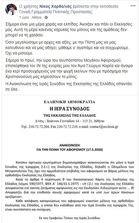 Ο κ. Χαρδαλιάς γράφει μεταξύ άλλων ότι “σήμερα είναι μια μέρα χαράς και ελπίδας. Άνοιξαν και πάλι οι Εκκλησίες μας. Αυτή τη μέρα κανένας κήρυκας του μίσους και της αμάθειας δεν μπορεί να τη χαλάσει”. Επίσης προσθέτει ότι “όσοι μεγαλώσαμε με αρχές και αξίες, με την Πίστη μας να μας κατευθύνει και να μας οδηγεί, μάθαμε ν’ αγαπάμε και να συγχωρούμε. Όχι να μισούμε”.