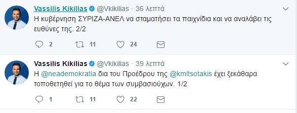 Με ανάρτηση του στον προσωπικό του λογαριασμό στο twitter ο εκπρόσωπος τύπου της ΝΔ Βασίλης Κικίλιας απάντησε στην κυβέρνηση.