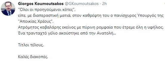 “”Όλοι οι προηγούμενοι κότες”, είπε, με διαπεραστική ματιά, στον καθρέφτη του ο πανίσχυρος Υπουργός της “Αποικίας Χρέους”. Ατρόμητος καβαλάρης εκείνος με πύρινη ρομφαία που έτρεμε όλη η υφήλιος. Ένα τρανταχτό γέλιο ακούστηκε από την Ανατολή… Τίτλοι τέλους. Καλές διακοπές” έγραψε ο βουλευτής της ΝΔ.