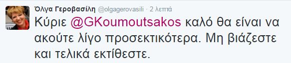 Μέσω του λογαριασμού της στο twitter η κυβερνητική εκπρόσωπος Όλγα Γεροβασίλη απαντά στον εκπρόσωπο τύπου της ΝΔ Γιώργο Κουμουτσάκο και στο σχόλιο του για τη δήλωση του αναπληρωτή υπουργού Οικονομικών Τρύφωνα Αλεξιάδη ότι «τελείωσαν τα άσχημα, έρχονται τα χειρότερα».