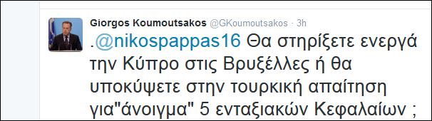 «Θα στηρίξετε ενεργά την Κύπρο στις Βρυξέλλες ή θα υποκύψετε στην τουρκική απαίτηση για “άνοιγμα” 5 ενταξιακών Κεφαλαίων;», έγραψε ο κ. Κουμουτσάκος απευθυνόμενος στον υπουργό Επικρατείας Νίκο Παππά.