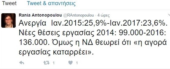 Απάντηση στις ανακοινώσεις της ΝΔ και τις δηλώσεις στελεχών της ότι η «αγορά εργασίας καταρρέει» και ότι χάθηκαν 114.000 θέσεις εργασίας, το πρώτο δίμηνο του 2017, δίνει η αναπληρώτρια υπουργός Εργασίας, αρμόδια για την Καταπολέμηση της Ανεργίας, Ράνια Αντωνοπούλου.Μέσω του προσωπικού λογαριασμού της στο Twitter, η κ. Αντωνοπούλου επισημαίνει ότι το ποσοστό της ανεργίας, τον Ιανουάριο του 2015, ανερχόταν στο 25,9%, σε σύγκριση με τον Ιανουάριο του 2017 που μειώθηκε στο 23,6%. Επίσης, σημειώνει ότι, το 2014, δημιουργήθηκαν 99.000 νέες θέσεις εργασίας, ενώ, το 2016, αυξήθηκαν σε 136.000. «Όμως, η ΝΔ θεωρεί ότι “η αγορά εργασίας καταρρέει”», αναφέρει χαρακτηριστικά η κ. Αντωνοπούλου.Υπενθυμίζεται, ότι χθες, ο Τομεάρχης Εργασίας, Κοινωνικής Ασφάλισης και Κοινωνικής Αλληλεγγύης της ΝΔ, Γιάννης Βρούτσης, δήλωσε πως «τα οικονομικά και κοινωνικά στοιχεία προμηνύουν ότι έρχεται θύελλα στην αγορά εργασίας που ήδη καταρρέει» και πρόσθεσε: «Η ΕΡΓΑΝΗ του τελευταίου πενταμήνου (Οκτώβριος 2016-Φεβρουάριος 2017) κατέγραψε τη χειρότερη επίδοση από την κρίση και μετά, με 114.224 χαμένες θέσεις εργασίας».Δείτε το tweet της αναπληρώτριας υπουργού Εργασίας: