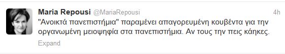 Απάντηση μέσω Twitter έδωσε η Μαρία Ρεπούση σε όσους την αποδοκίμασαν κατά τη διάρκεια της ομιλίας της στο Εθνικό και Καποδιστριακό Πανεπιστήμιο Αθηνών σε εκδήλωση με θέμα: «Το μέτρο της διαθεσιμότητας και οι συνέπειες του για το δημόσιο Πανεπιστήμιο και την κοινωνία».
