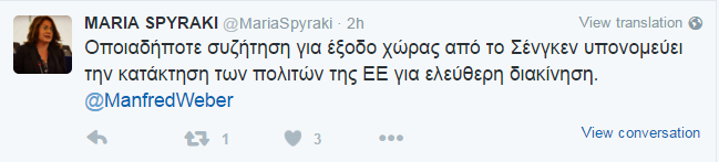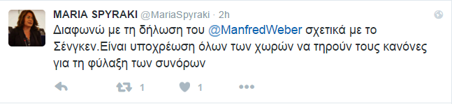 «Διαφωνώ με τη δήλωση του ManfredWeber σχετικά με το Σένγκεν. Είναι υποχρέωση όλων των χωρών να τηρούν τους κανόνες για τη φύλαξη των συνόρων. Οποιαδήποτε συζήτηση για έξοδο χώρας από το Σένγκεν υπονομεύει την κατάκτηση των πολιτών της ΕΕ για ελεύθερη διακίνηση» έγραψε στο λογαριασμό της στο Twitter η ευρωβουλευτής.
