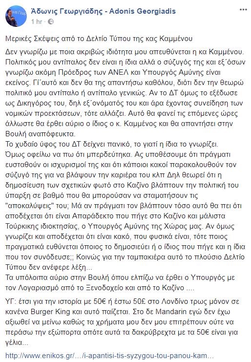 «Το χυδαίο ύφος του Δελτίου Τύπου δείχνει πανικό, το γιατί η ίδια το γνωρίζει», αναφέρει μεταξύ άλλων ο Άδωνις Γεωργιάδης στον προσωπικό του λογαριασμό στο facebook, σχολιάζοντας τη δήλωση της Έλενας Τζούλη για το καζίνο στο Λονδίνο.«Δεν γνωρίζω με ποια ακριβώς ιδιότητα μου απευθύνεται η κα Καμμένου. Πολιτικός μου αντίπαλος δεν είναι η ίδια αλλά ο σύζυγός της και εξ´ όσων γνωρίζω ακόμη Πρόεδρος των ΑΝΕΛ και Υπουργός Αμύνης είναι εκείνος. Γι αυτό και δεν θα της απαντήσω καθόλου, διότι δεν την θεωρώ πολιτικό μου αντίπαλο ή αντίπαλο γενικώς. Αν το Δελτίο Τύπου όμως το εξέδωσε ως Δικηγόρος του, δηλ εξ´ ονόματός του και άρα έχοντας συνείδηση των νομικών προεκτάσεων, τότε αλλάζει. Αυτό θα φανεί τις επόμενες ώρες άλλωστε θα έρθει αύριο ο ίδιος ο κ. Καμμένος και θα απαντήσει στην Βουλή αναπόφευκτα», αναφέρει χαρακτηριστικά και συνεχίζει:«Το χυδαίο ύφος του ΔΤ δείχνει πανικό, το γιατί η ίδια το γνωρίζει. Όμως οφείλω να πω ότι μπερδεύτηκα. Ας υποθέσουμε ότι πράγματι ευσταθούν οι ισχυρισμοί της και ότι κάποιοι κακοί παρακολουθούν τον σύζυγό της για να βλάψουν την καριέρα του κλπ, Δηλαδή θεωρεί ότι η δημοσίευση των σχετικών φωτό στο Καζίνο βλάπτουν την πολιτική του ύπαρξη σε βαθμό που θα μπορούσαν να σταματήσουν τις “αποκαλύψεις” του; Μα αν πράγματι τον βλάπτουν τόσο αυτό θα πει ότι αποδέχεται ότι είναι απαράδεκτο που πήγε στο Καζίνο και μάλιστα Τούρκικης ιδιοκτησίας, ο Υπουργός Αμύνης της Χώρας μας. Αν όμως γνωρίζει και αποδέχεται ότι είναι κακό, που φυσικά είναι, τότε ποιος πραγματικά ευθύνεται όποιος το δημοσιεύει ή ο ίδιος που πήγε και η ίδια που τον συνόδευσε;; Κοινώς για την ταμπακιέρα αυτό το πλούσιο Δελτίο Τύπου δεν ανέφερε λέξη…Τα υπόλοιπα αύριο στην Βουλή όπου ελπίζω να έρθει ο Υπουργός με τον Λογαριασμό από το Ξενοδοχείο και από το Καζίνο ….ΥΓ: έτσι για την ιστορία με 50€ ή έστω 50£ στο Λονδίνο τρως μόνον σε κανένα Burger King και αυτό παίζεται. Στο δε Mandarin εγώ δεν έχω αξιωθεί να μείνω καθώς τα χρήματα μου δεν μου επιτρέπουν ούτε να περάσω την εξώπορτα οπότε αυτά τα δακρύβρεχτα με τα 50€ είναι για γέλια..».