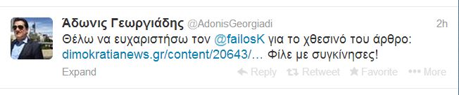 «Θέλω να ευχαριστήσω τον @failosK για το χθεσινό του άρθρο. Φίλε με συγκίνησες!».