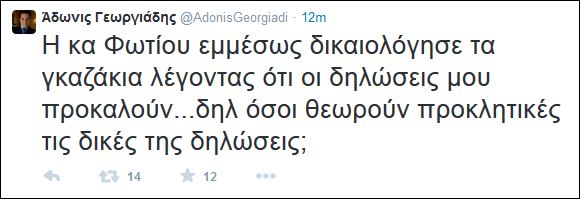 «Η κα Φωτίου εμμέσως δικαιολόγησε τα γκαζάκια λέγοντας ότι οι δηλώσεις μου προκαλούν…δηλ όσοι θεωρούν προκλητικές τις δικές της δηλώσεις;», αναφέρει σε ανάρτηση στον προσωπικό του λογαριασμό στο Twitter ο υποψήφιος βουλευτής με τη Νέα Δημοκρατία.