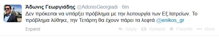 “Δεν πρόκειται να υπάρξει πρόβλημα με την λειτουργία των Εξωτερικών Ιατρείων. Το πρόβλημα λύθηκε, την Τετάρτη θα έχουν πάρει τα λεφτά” απάντησε ο υπουργός Υγείας Άδωνις Γεωγιάδης μέσω Twitter στο enikos.gr