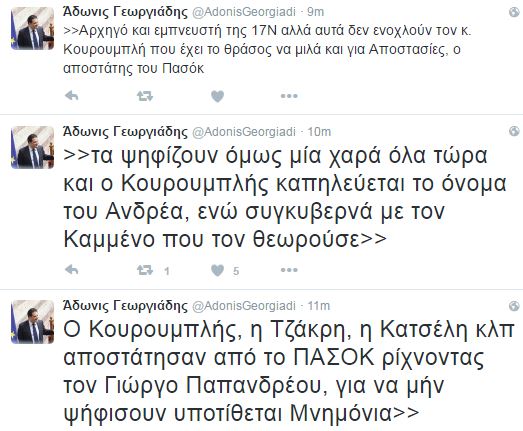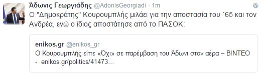 «Ο “Δημοκράτης” Κουρουμπλής μιλάει για την αποστασία του ´65 και τον Ανδρέα, ενώ ο ίδιος αποστάτησε από το ΠΑΣΟΚ», σχολίασε αρχικά ο Άδωνις Γεωργιάδης, κάτω από την ανάρτηση του enikos.gr στο twitter σχετικά με την άρνηση του Π. Κουρουμπλή, να αρνηθεί την παρέμβασή του.