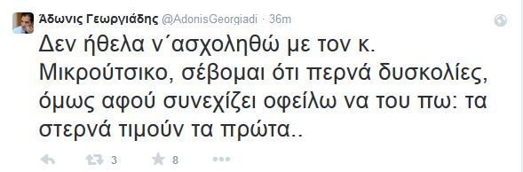 Στην κριτική που δέχθηκε από τον παρουσιαστή Ανδρέα Μικρούτσικο, απάντησε ο κοινοβουλευτικός εκπρόσωπος της Νέας Δημοκρατίας, Άδωνις Γεωργιάδης, μέσω του προσωπικού του λογαριασμού στο Twitter. Συγκεκριμένα, ο κ. Γεωργιάδης, έγραψε: «Δεν ήθελα να ασχοληθώ με τον κ. Μικρούτσικο, σέβομαι ότι περνά δυσκολίες, όμως αφού συνεχίζει οφείλω να του πω: τα στερνά τιμούν τα πρώτα..».