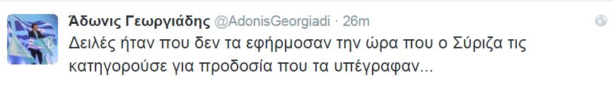 «Δειλές ήταν που δεν τα εφήρμοσαν την ώρα που ο Σύριζα τις κατηγορούσε για προδοσία που τα υπέγραφαν…» έγραψε στον προσωπικό του λογαριασμό στο twitter ο υποψήφιος πρόεδρος της Νέας Δημοκρατίας.