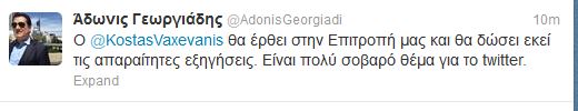 “Ο Κώστας Βαξεβάνης θα έρθει στην Επιτροπή μας και θα δώσει εκεί τις απαραίτητες εξηγήσεις. Είναι πολύ σοβαρό θέμα για το twitter”, έγραψε ο βουλευτής της ΝΔ και μέλος της Προανακριτικής.