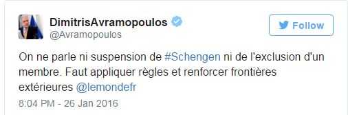 Με ένα tweet στα γαλλικά, ο Επίτροπος Μετανάστευσης Δημήτρης Αβραμόπουλος διαψεύδει πως το Κολλέγιο των Επιτρόπων συνεδριάζει σήμερα για να “πετάξει” την Ελλάδα από τη συνθήκη Σένγκεν.