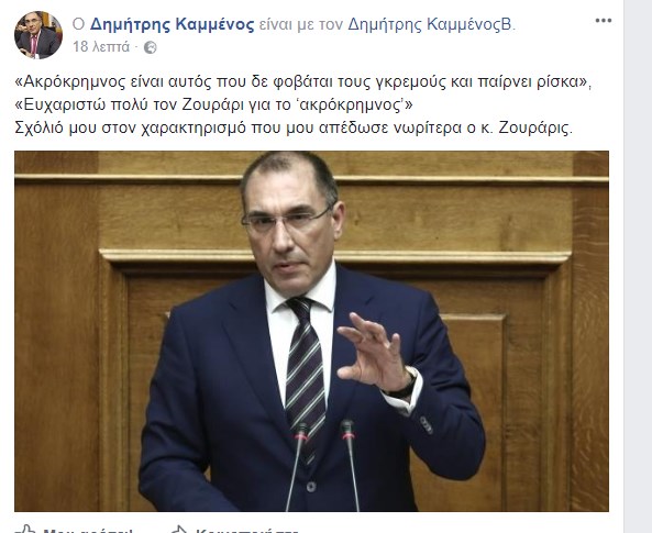 «Για μένα προσωπικά έχει λήξει το ζήτημα, έχουμε κάνει πολλές συζητήσεις με τον Κώστα, τον σέβομαι και τον αγαπώ σαν καθηγητή και τα βιβλία του τα διαβάζω, όμως κάποιες φορές ξεπερνά τα εσκαμμένα, δημιουργεί κάποια ζητήματα συναδελφικά και διχαστικά. Είναι ο χαρακτήρας του αλλά αυτό ως υφυπουργός Παιδείας δεν θα πρέπει να το κάνει διότι η παιδεία δεν είναι να χρησιμοποιεί συνθήματα των ακραίων φιλάθλων στον δημόσιο λόγο συν ότι προσβάλει μεγάλα κομμάτια του πληθυσμού» είπε ο κ. Καμμένος.Σχολιάζοντας τον χαρακτηρισμό «ακρόκρημνος» που του απέδωσε ο κ. Ζουράρις, μιλώντας νωρίτερα στον ΑΝΤ1,είπε ότι είναι «αυτός που παίρνει ρίσκα και δεν φοβάται τους γκρεμούς. «Τον ευχαριστώ πολύ». Λίγο αργότερα μάλιστα απάντησε στον Κώστα Ζουράρι και με σχετική ανάρτηση στο Facebook