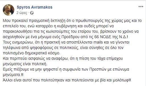 Μέσω facebook απάντησε στην ανακοίνωση του Μεγάρου Μαξίμου σχετικά με την αποστολή μαζικών μηνυμάτων προς βουλευτές της συγκυβέρνησης να καταψηφίσουν τη Συμφωνία των Πρεσπών, ο πρόεδρος της Β4 ΝΟΔΕ της ΝΔ, Σπύρος Αβραμάκος.