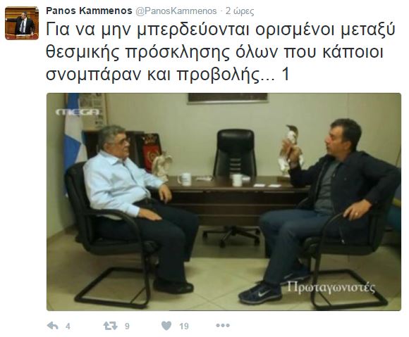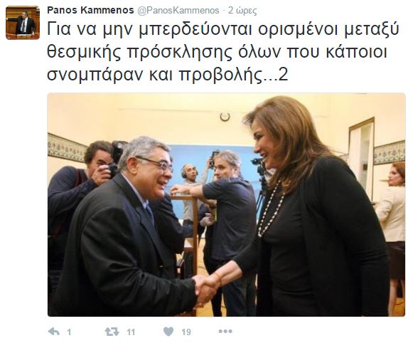Ο Πάνος Καμμένος δημοσίευσε μία φωτογραφία με χειραψία της Ντόρας Μπακογιάννη και του Νίκου Μιχαλολιάκου, καθώς και μία φωτογραφία του Σταύρου Θεοδωράκη με τον αρχηγό της Χρυσής Αυγής, από τη συνέντευξή του στους «Πρωταγωνιστές».