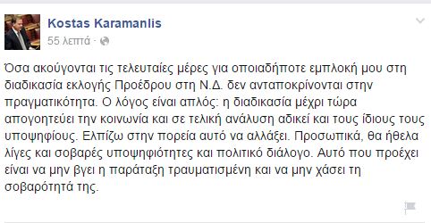 Σήμερα με ανάρτησή του στο Facebook ξεκαθαρίζει ακόμη περισσότερο τη στάση του διαψεύδοντας όλα τα σενάρια περί εμπλοκής του στη διαδικασία εκλογής του προέδρου της ΝΔ.
