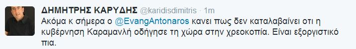Μέσω twitter απάντησε ο Γραμματέας Επικοινωνίας του ΠΑΣΟΚ, Δημήτρης Καρύδη, στον Ευάγγελο Αντώναρο, ο οποίος έκανε λόγο για «κάποιους αρχι-ΠΑΣΟΚΟΥΣ που στάζουν χολή επειδή ανέλαβε τα ΕΛΠΕ ο Γιάννης Παπαθανασίου».