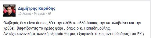 «Θλιβερός δεν είναι όποιος λέει την αλήθεια, αλλά όποιος την καταλαβαίνει και την κρύβει, βαφτίζοντας το κρέας ψάρι, όπως ο κ. Παπαδημούλης.