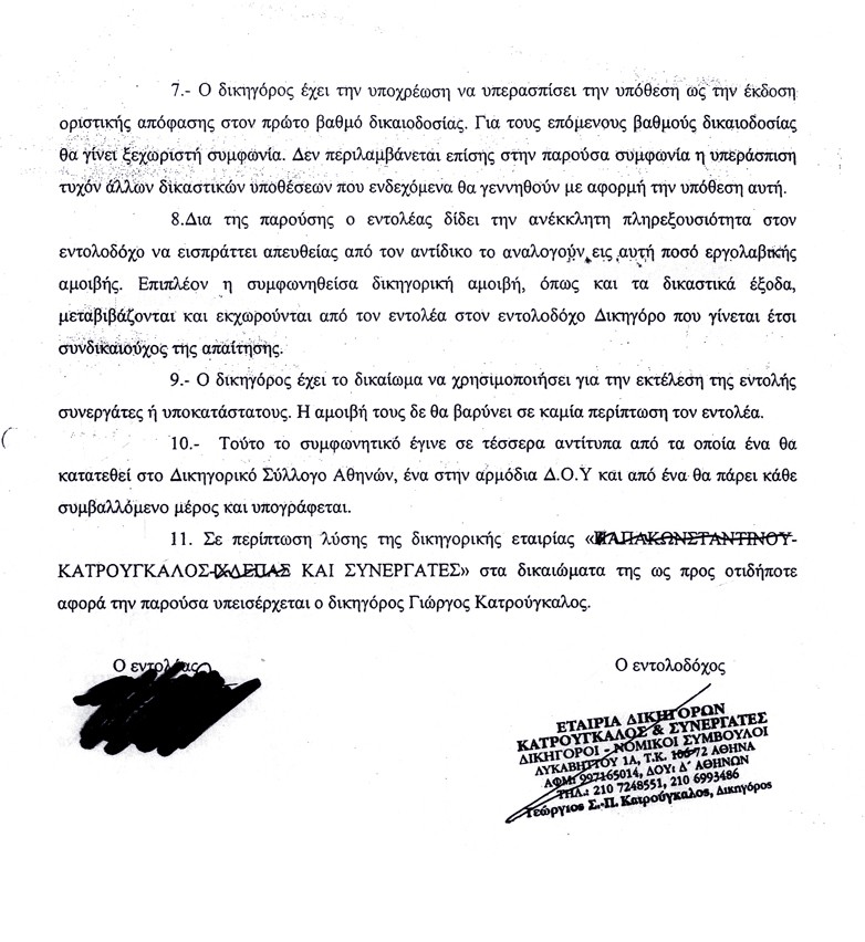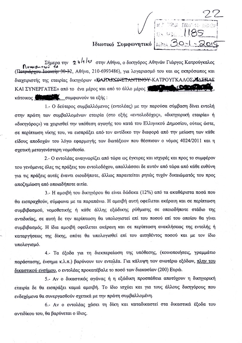 1. Η δικηγορική εταιρεία Κατρούγκαλος και Συνεργάτες που ιδρύθηκε τον Ιούλιο του 2014 μετά την εκλογή του κ. Κατρούγκαλου στο Ευρωπαϊκό Κοινοβούλιο, δεν έχει καταθέσει ούτε ένα συμβόλαιο στο Δικηγορικό Σύλλογο Αθηνών έως την ημερομηνία των εθνικών εκλογών, δηλαδή έως τις 25 Ιανουαρίου. Αντιθέτως στις 30 Ιανουαρίου, δυο ημέρες δηλαδή, μετά την ανάληψη των υπουργικών του καθηκόντων και ενώ έχει επανειλημμένα δηλώσει ότι ανέστειλε πλήρως την δικηγορική του ιδιότητα η εταιρεία του Γιώργου Κατρούγκαλου καταθέτει στον ΔΣΑ 22 πανομοιότυπα συμφωνητικά, όπως αυτό που δημοσίευσε το «Βήμα της Κυριακής» και κατοχυρώνει σε όλα αμοιβή 12% επί των ακαθάριστων αποδοχών που θα διασφαλίσουν οι πελάτες του. Και τα 22 συμφωνητικά προβλέπουν ρητώς ότι στην περίπτωση διάλυσης της εταιρείας Κατρούγκαλου (διαλύθηκε δυο εβδομάδες αργότερα) τα δικαιώματα της αμοιβής ανήκουν αποκλειστικά στον Γιώργο Κατρούγκαλο.